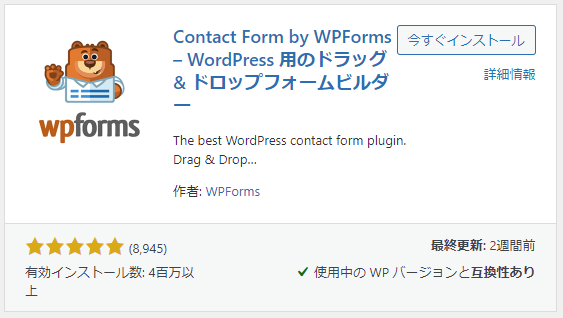 クマのアイコンの「Contact Form by WPForms – WordPress 用のドラッグ & ドロップフォームビルダー」にある「今すぐインストール」をクリック