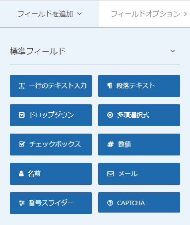 メールの題名が欲しい場合は、左側にある「フィールドを追加」タブから「一行のテキスト入力」をメールとコメントまたはメッセージの間にドラッグアンドドロップして追加しましょう。