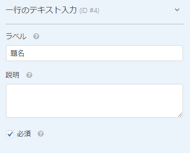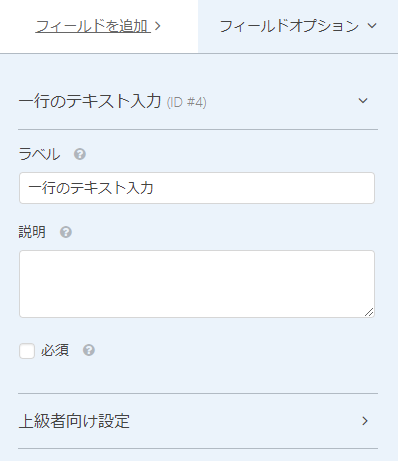 一行のテキスト入力をクリックするとフィールドオプションが左側に表示されラベルの変更と必須項目にするか選択できます。