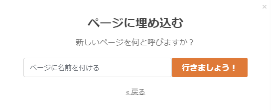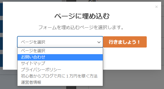 ページに名前を付ける欄に「お問い合わせ」と入力しオレンジ色の「行きましょう!」ボタンをクリックします。